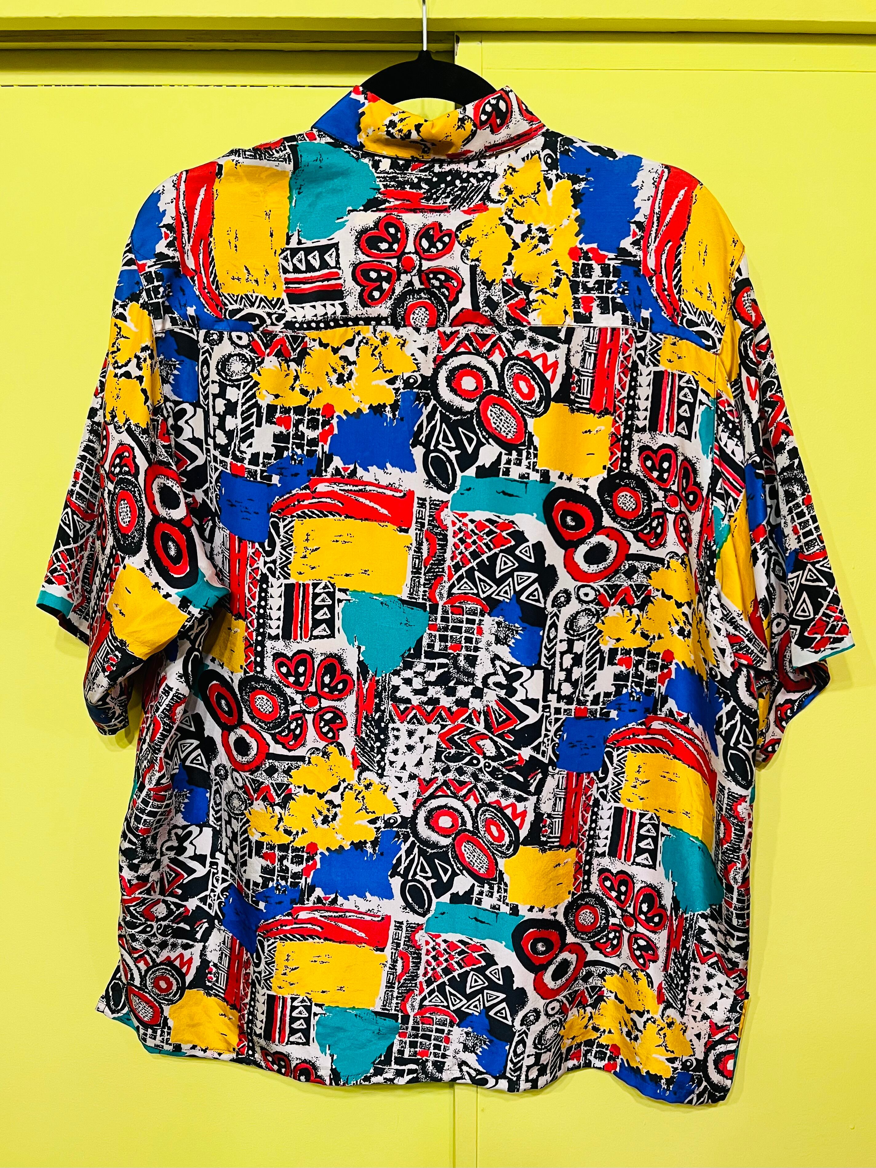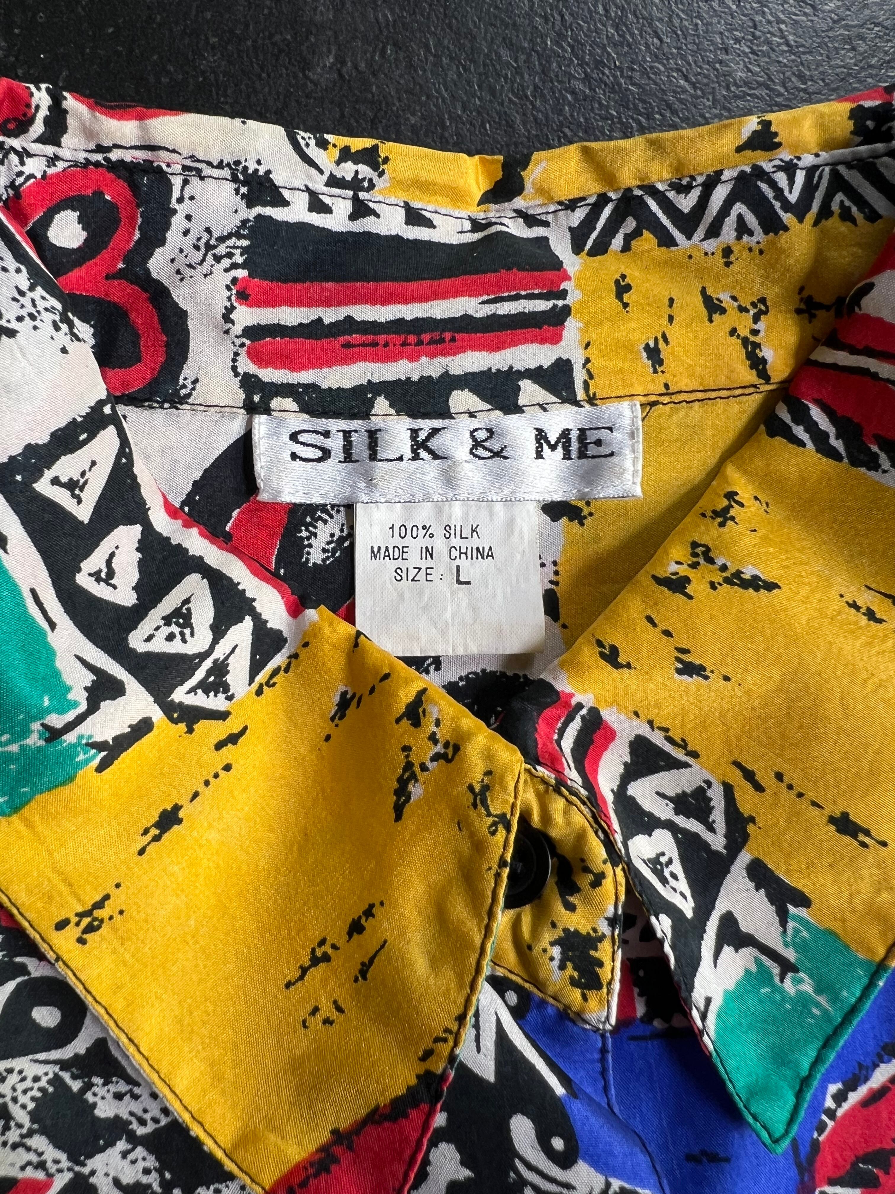 目を引くアブストラクト柄のシャツ。独特な模様が印象的で、一枚でコーディネートのポイントになってくれるアイテムです。シルク100%の柔かく、さらりとした素材感は、リラックスした着心地を実現し、カジュアルな日常使いはもちろん、イベントなど特別な場にも適したスタイルに仕上げてくれます。シンプルなボトムスと合わせるだけで、存在感を際立たせることができる魅力的な一枚です。左裾部分に目立たないですが折れ線があり。