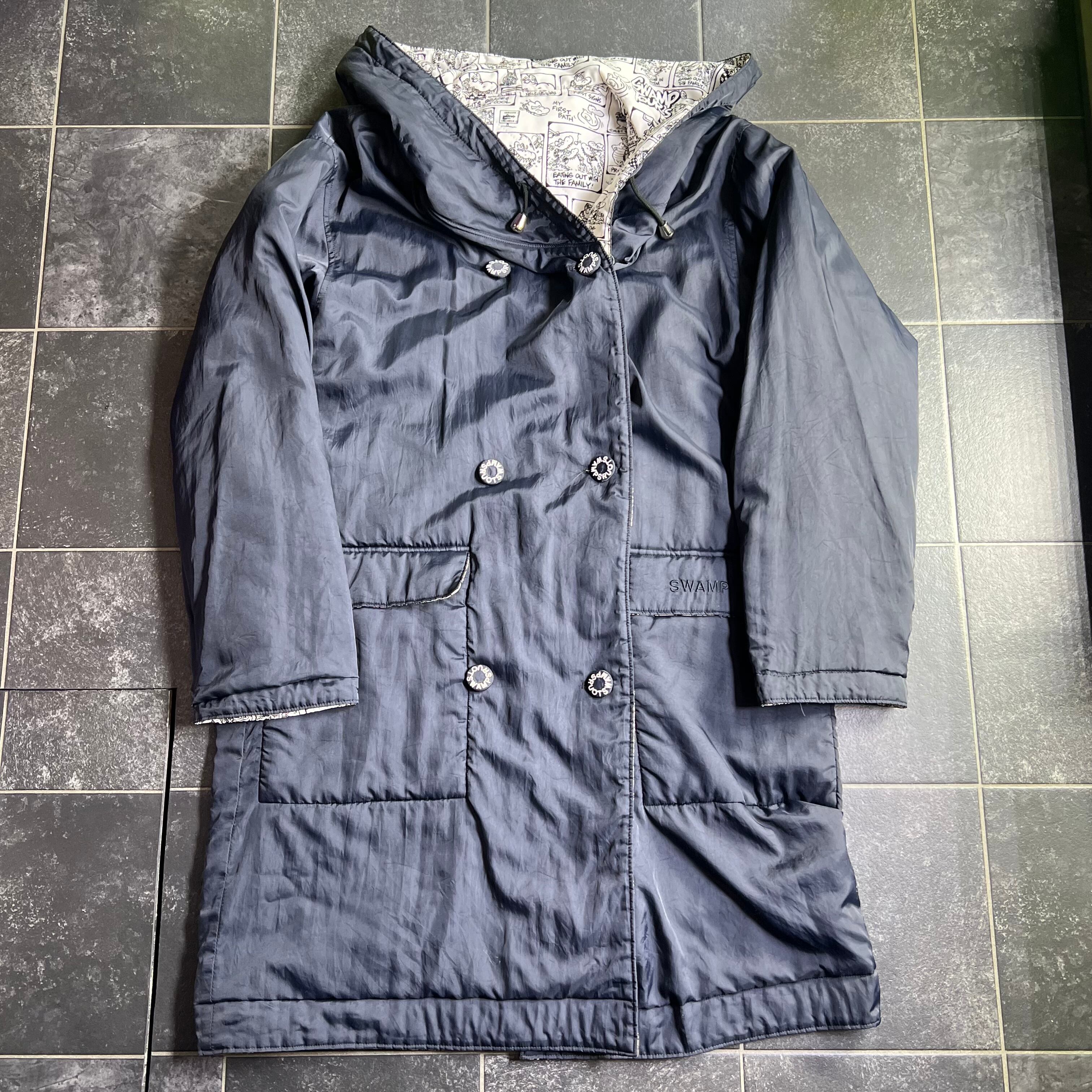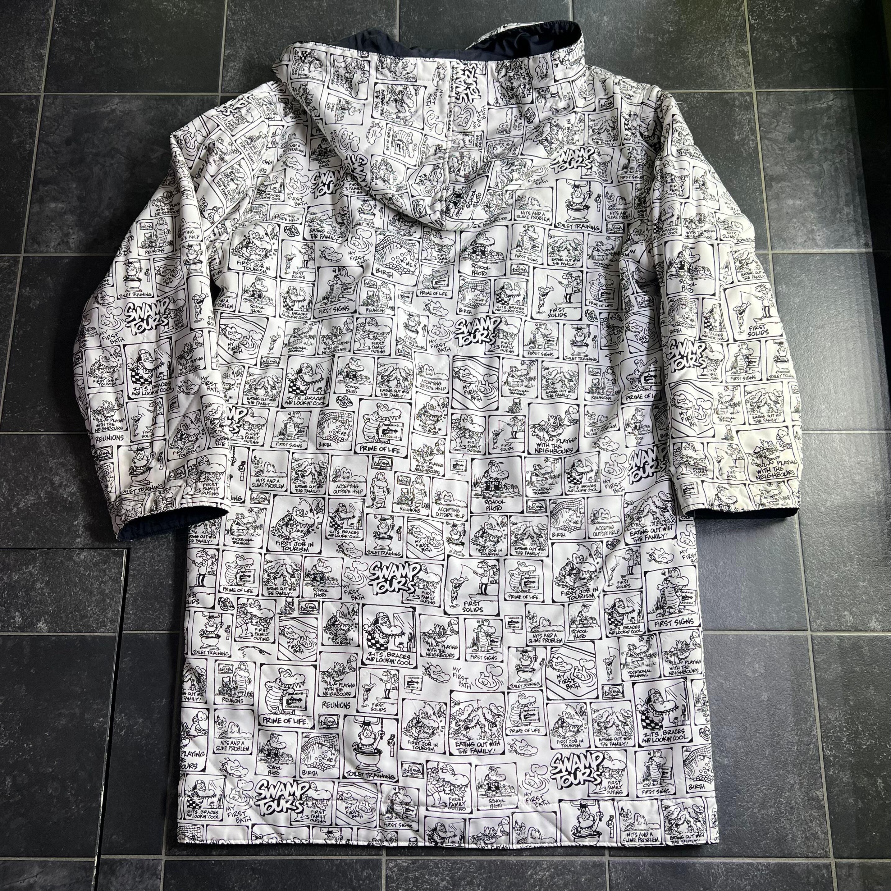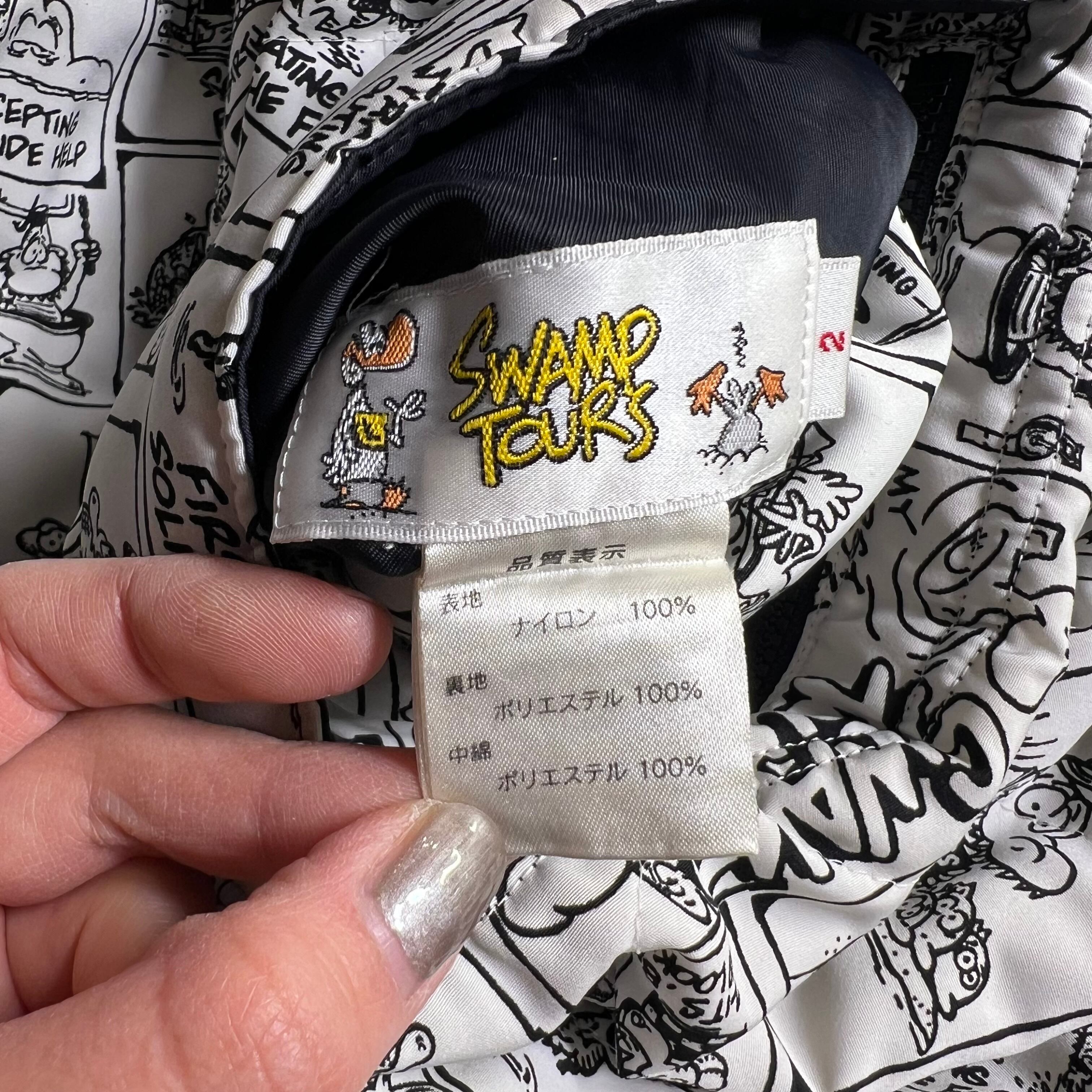 コミカルなワニのアメコミ風柄とシンプルな黒無地のリバーシブルデザイン。気分やスタイルに応じてその日のコーディネートに合わせられる一枚です。SWAMP TOURSというゴルフブランドのコートで、とても軽いのに温かく着心地は抜群。