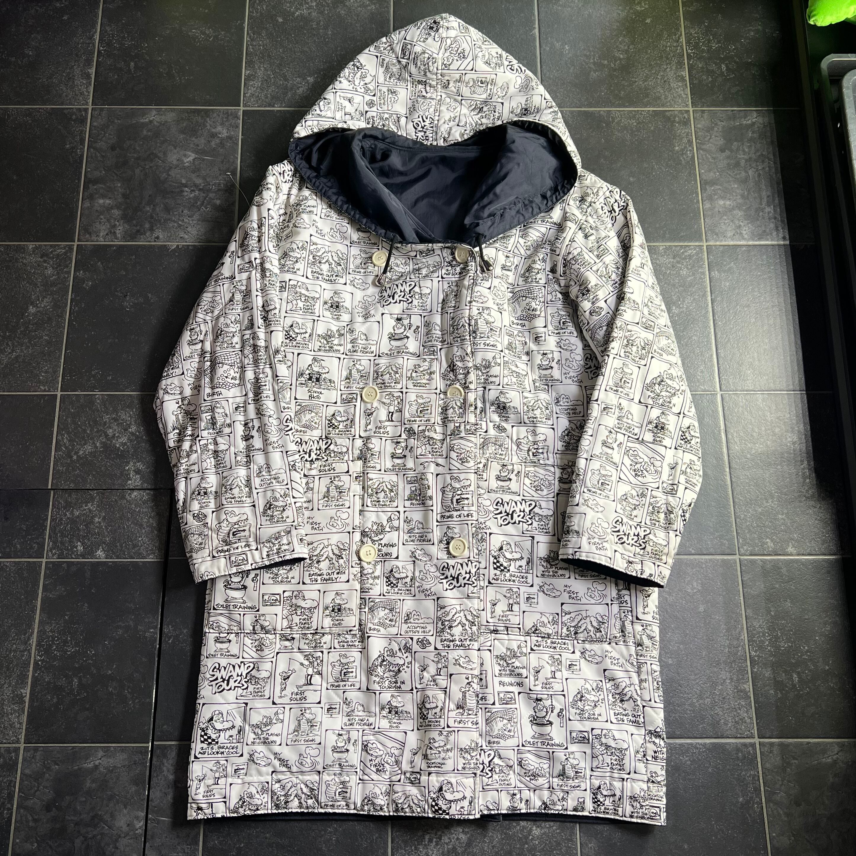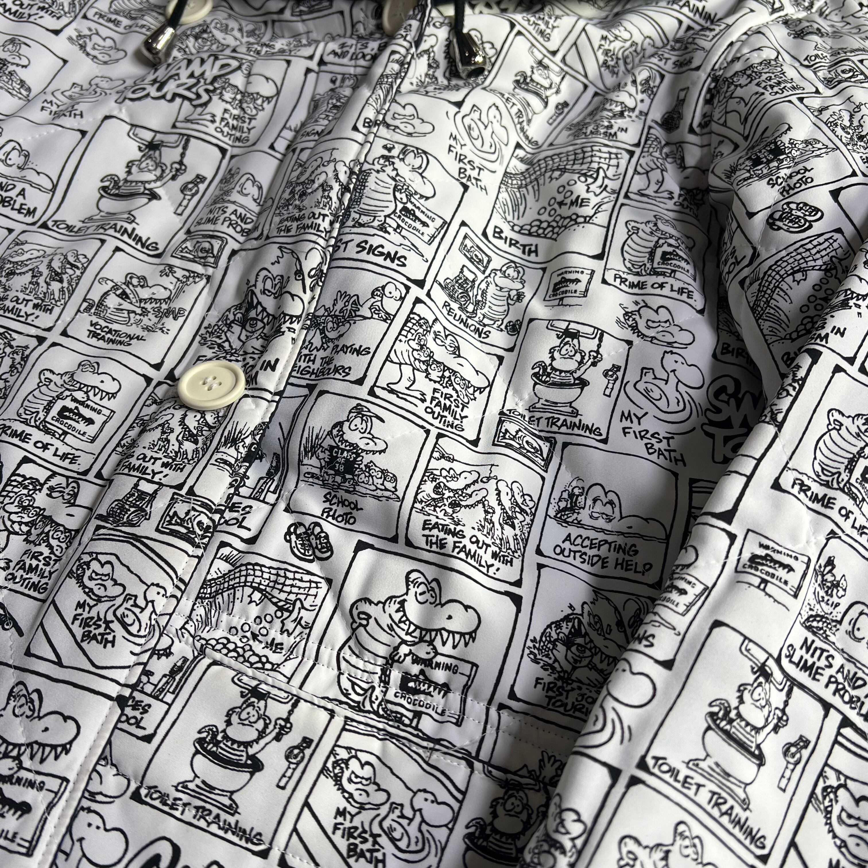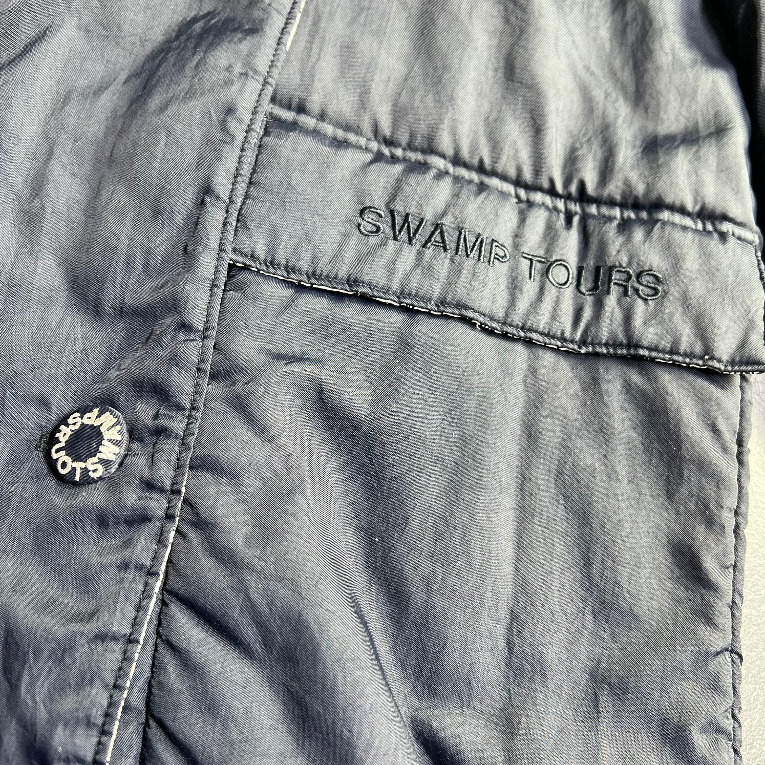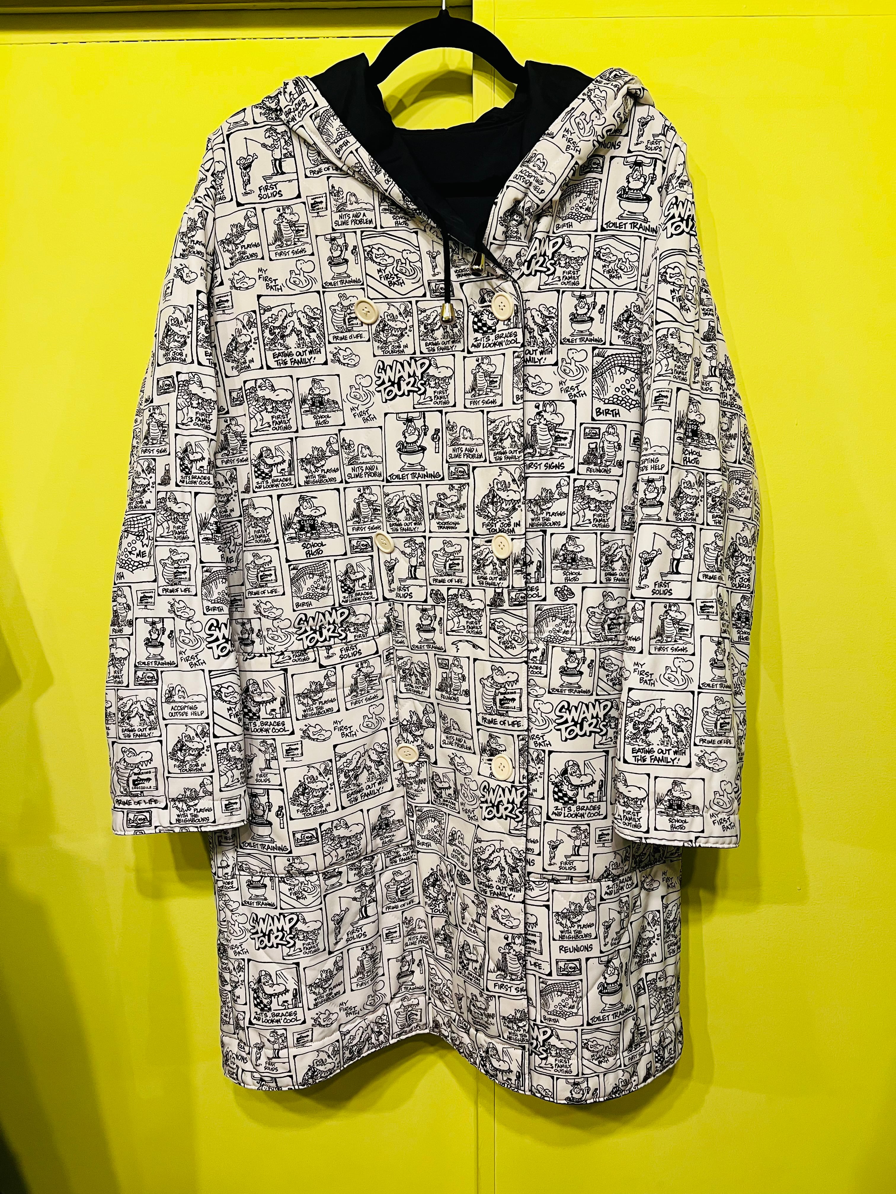 コミカルなワニのアメコミ風柄とシンプルな黒無地のリバーシブルデザイン。気分やスタイルに応じてその日のコーディネートに合わせられる一枚です。SWAMP TOURSというゴルフブランドのコートで、とても軽いのに温かく着心地は抜群。